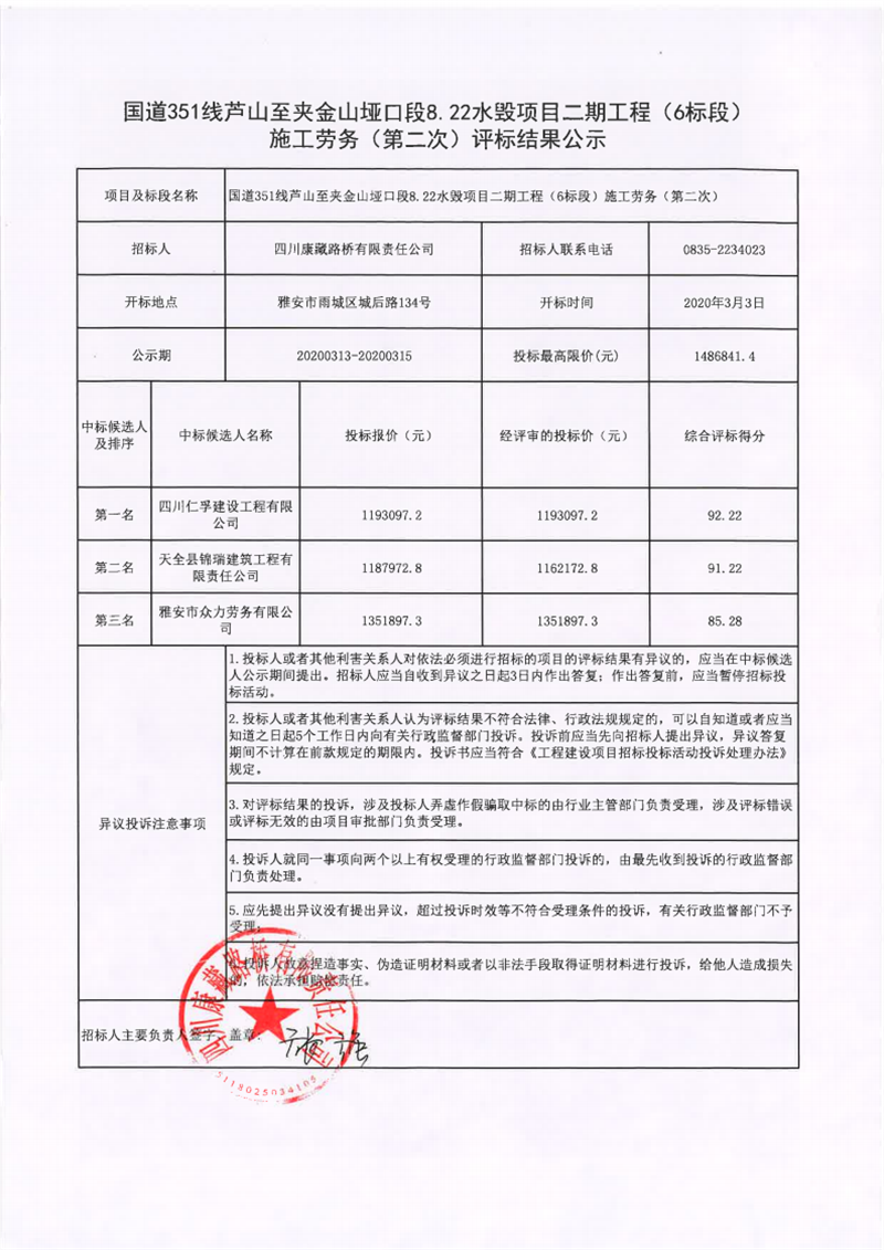 四川康藏路桥有限责任公司国道351线芦山至夹金山垭口段8.22水毁项目二期工程(1标段)施工劳务(第二次)评标结果公示