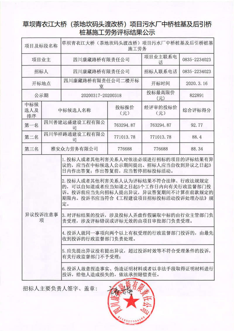 四川康藏路桥有限责任公司草坝青衣江大桥(茶地坎码头渡改桥)项目污水厂中桥桩基及后引桥桩基施工劳务评标结果公示