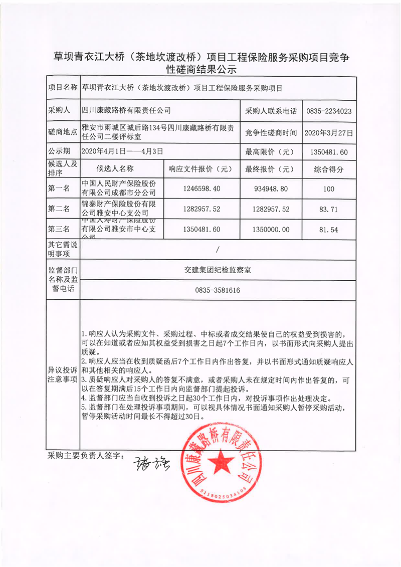 四川康藏路桥有限责任公司草坝青衣江大桥(茶地坎渡改桥)项目工程保险服务采购项目竞争性磋商结果公示