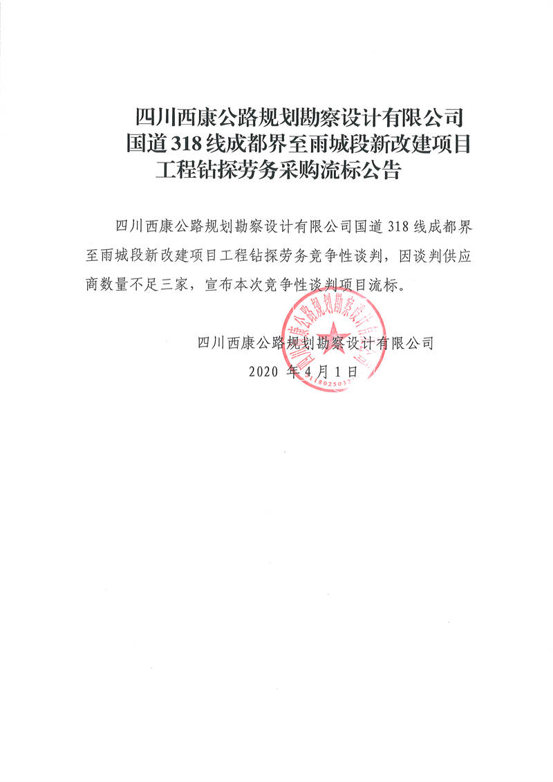 四川西康公路规划勘察设计有限公司国道318线成都界至雨城段新改建项目工程钻探劳务采购流标公告
