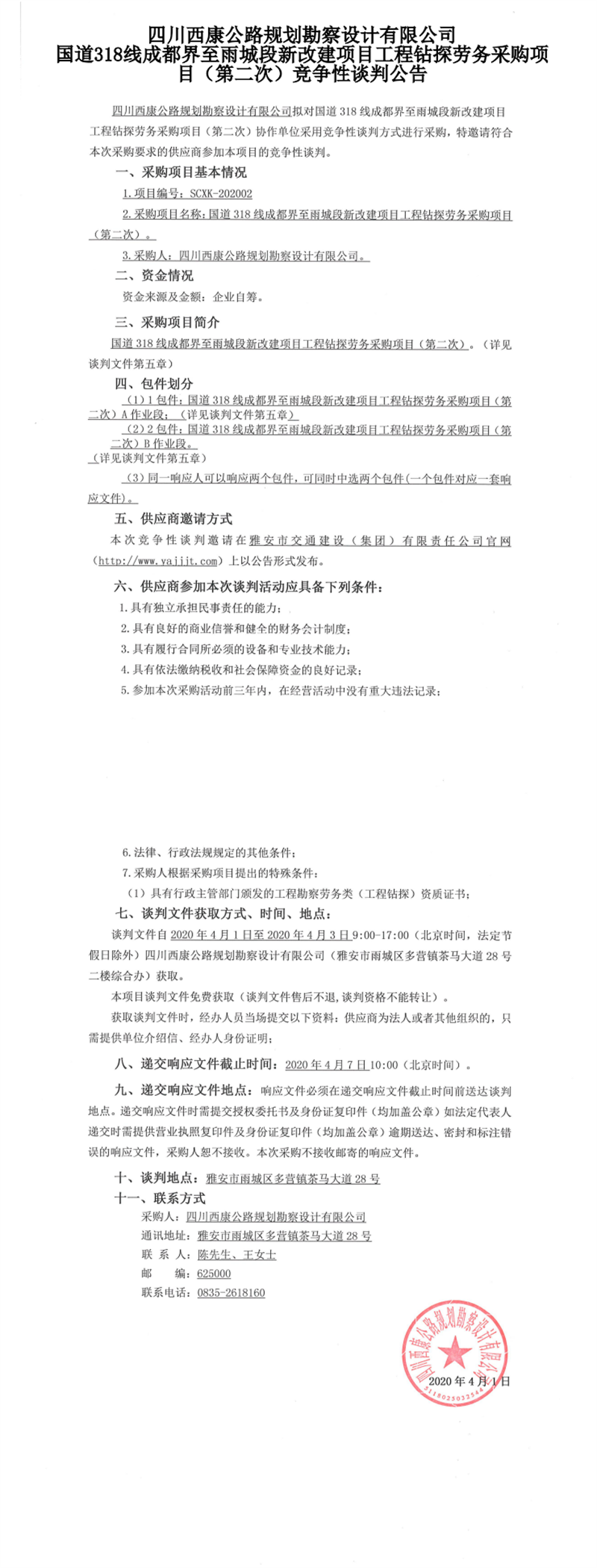 四川西康公路规划勘察设计有限公司国道318线成都界至雨城段新改建项目工程钻探劳务采购项目(第二次)竞争性谈判公告