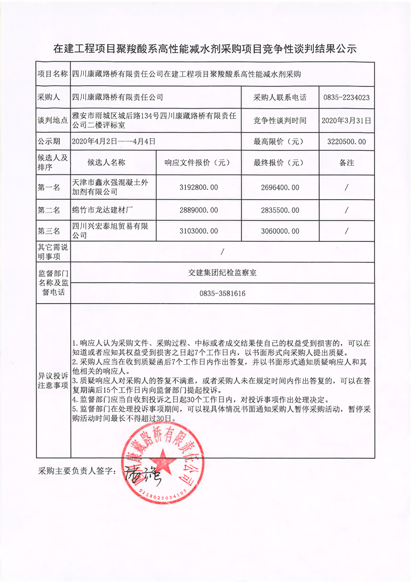 四川康藏路桥有限责任公司在建工程项目聚羧酸系高性能减水剂采购项目竞争性谈判结果公示