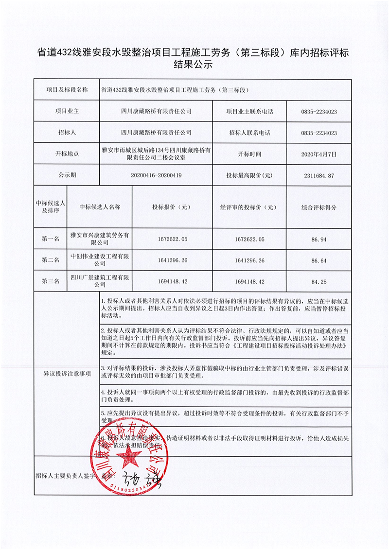 四川康藏路桥有限责任公司省道432线雅安段水毁整治项目工程施工劳务(第三标段)库内招标评标结果公示