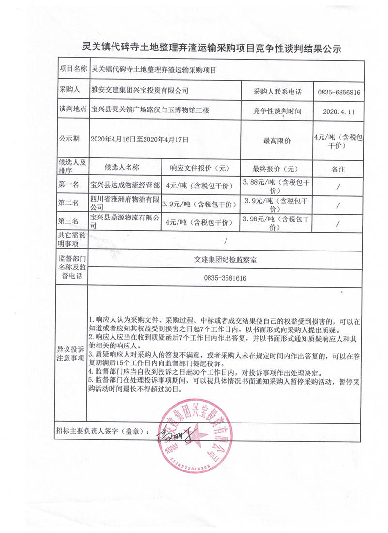 米兰体育-米兰(中国)官网 兴宝投资有限公司灵关镇代碑寺土地整理弃渣运输采购项目竞争性谈判结果公示
