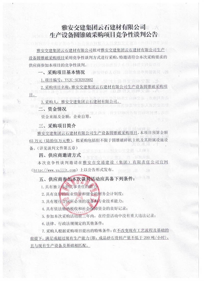 米兰体育-米兰(中国)官网 云石建材有限公司生产设备圆锥破采购项目竞争性谈判公告