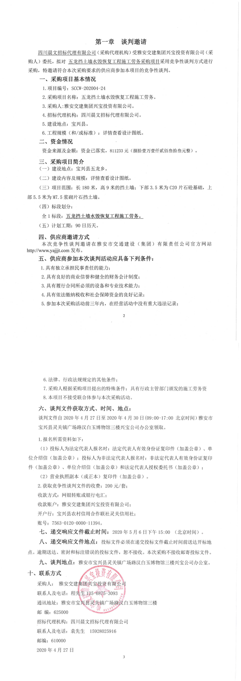 米兰体育-米兰(中国)官网 兴宝投资有限公司五龙挡土墙水毁恢复工程施工劳务采购项目竞争性谈判公告