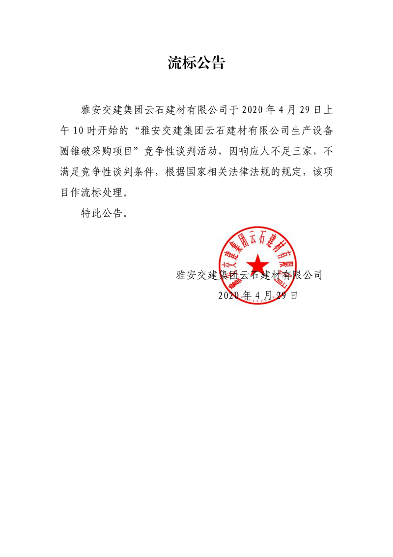 米兰体育-米兰(中国)官网 云石建材有限公司生产设备圆锥破采购项目流标公告