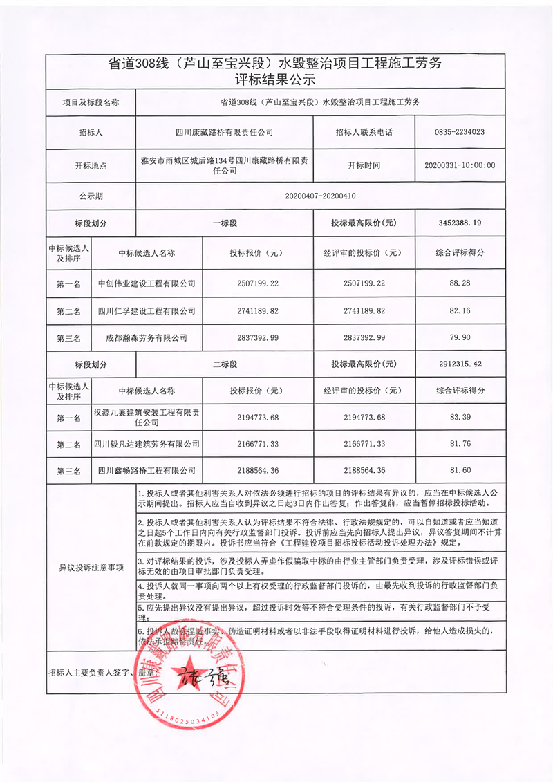 四川康藏路桥有限责任公司省道308线(芦山至宝兴段)水毁整治项目工程施工劳务评标结果公示