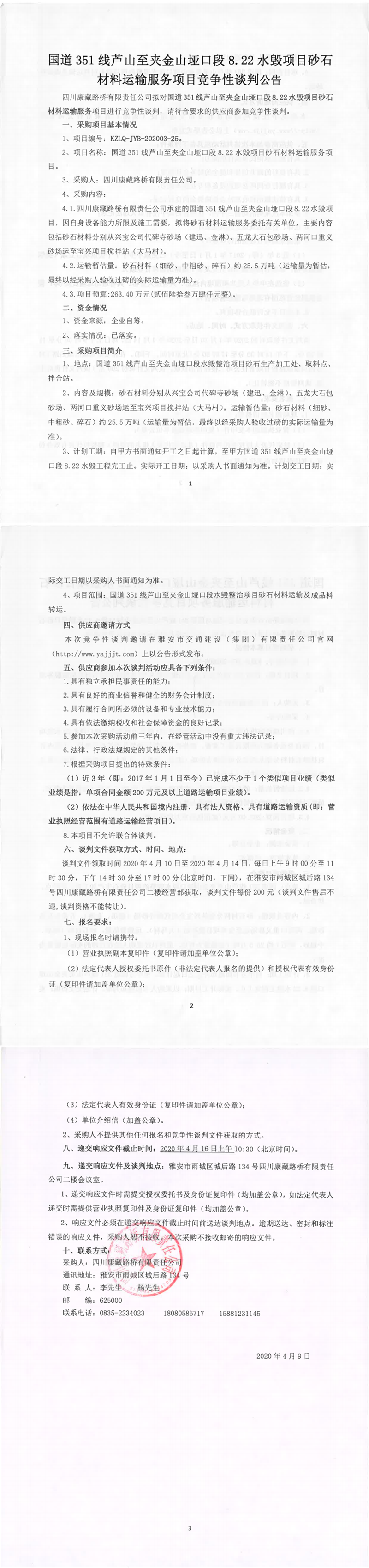 四川康藏路桥有限责任公司国道351线芦山至夹金山垭口8.22水毁项目砂石材料运输服务项目竞争性谈判公告