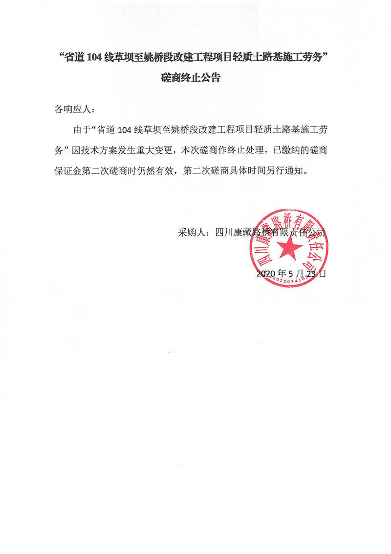 四川康藏路桥有限责任公司省道104线草坝至姚桥段改建工程项目轻质土路基施工劳务磋商终止公告