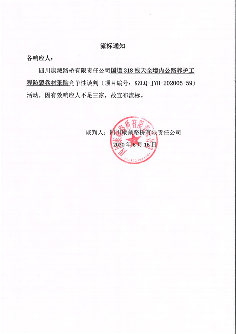 四川康藏路桥有限责任公司国道318线天全境内公路养护工程防裂卷材采购流标通知