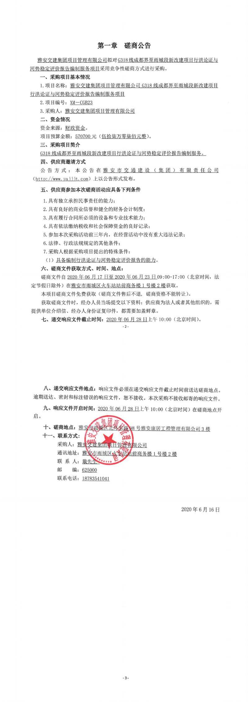 米兰体育-米兰(中国)官网 项目管理有限公司G318线成都界至雨城段新改建项目行洪论证与河势稳定评价报告编制服务项目竞争性磋商公告