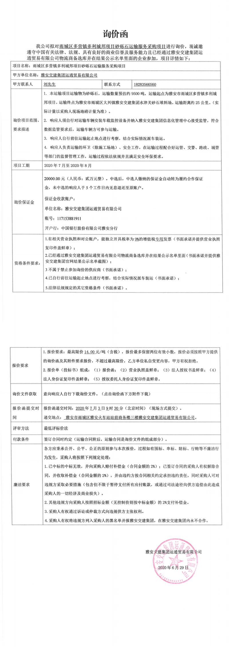 米兰体育-米兰(中国)官网 运通贸易有限公司雨城区多营镇多利城邦项目砂砾石运输服务采购项目询价函