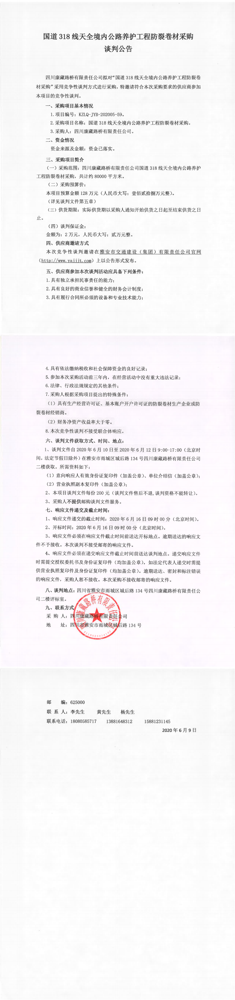 四川康藏路桥有限责任公司国道318线天全境内公路养护工程防裂卷材采购竞争性谈判公告