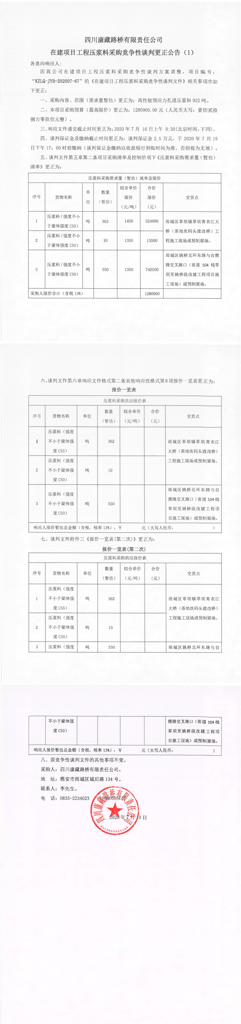 四川康藏路桥有限责任公司在建项目工程压浆料采购竞争性谈判更正公告(1)