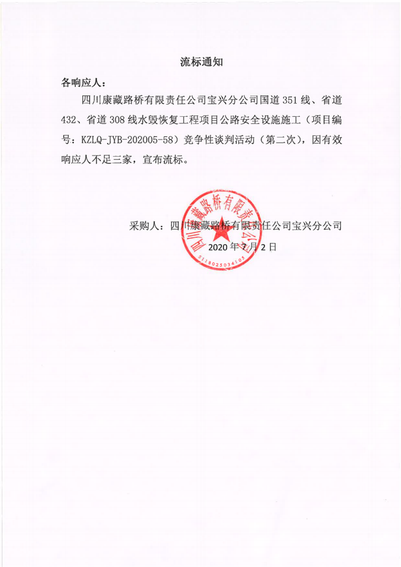 四川康藏路桥有限责任公司宝兴分公司国道351线、省道432线、省道308线水毁恢复项目公路安全设施施工竞争性谈判(第二次)流标通知