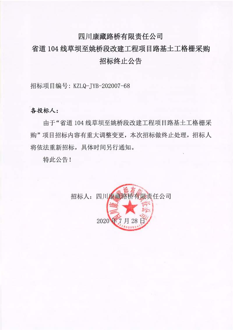 四川康藏路桥有限公司省道104线草坝至姚桥段改建工程项目路基土工格栅采购招标终止公告