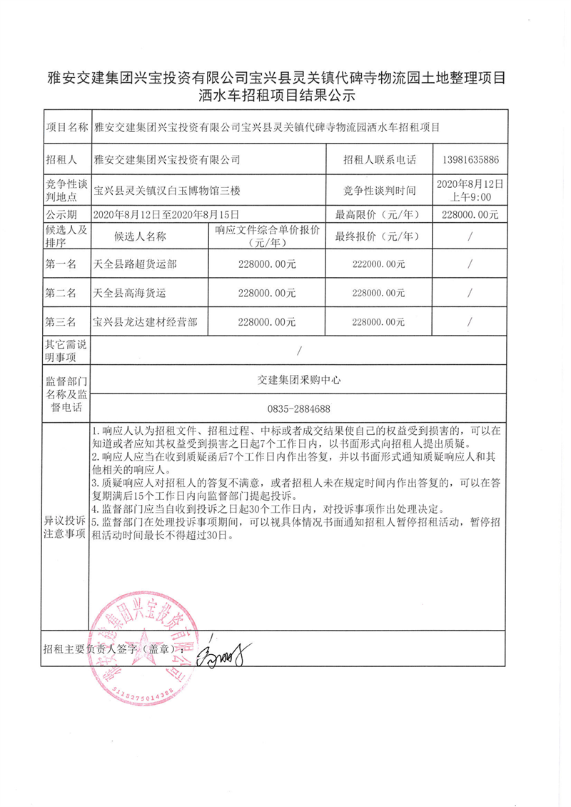 米兰体育-米兰(中国)官网 兴宝投资有限公司宝兴县灵关镇代碑寺物流园洒水车招租项目结果公示