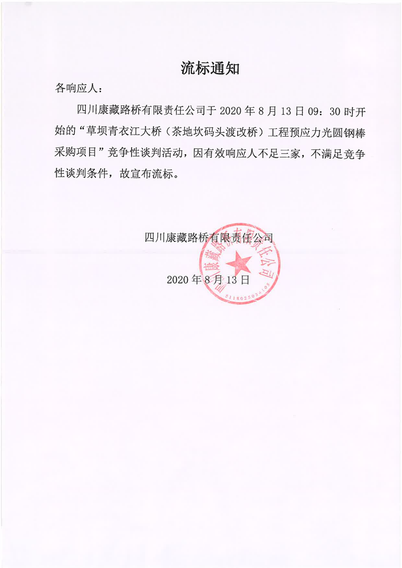 四川康藏路桥有限责任公司草坝青衣江大桥(茶地坎码头渡改桥)工程预应力光圆钢棒采购项目流标通知