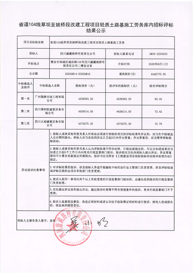 四川康藏路桥有限责任公司省道104线草坝至姚桥段改建工程项目轻质土路基施工劳务库内招标评标结果公示