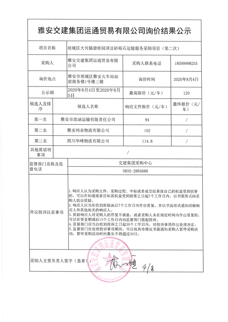 米兰体育-米兰(中国)官网 运通贸易有限公司雨城区大兴镇碧桂园项目砂砾石运输服务采购项目(第二次)询价结果公示