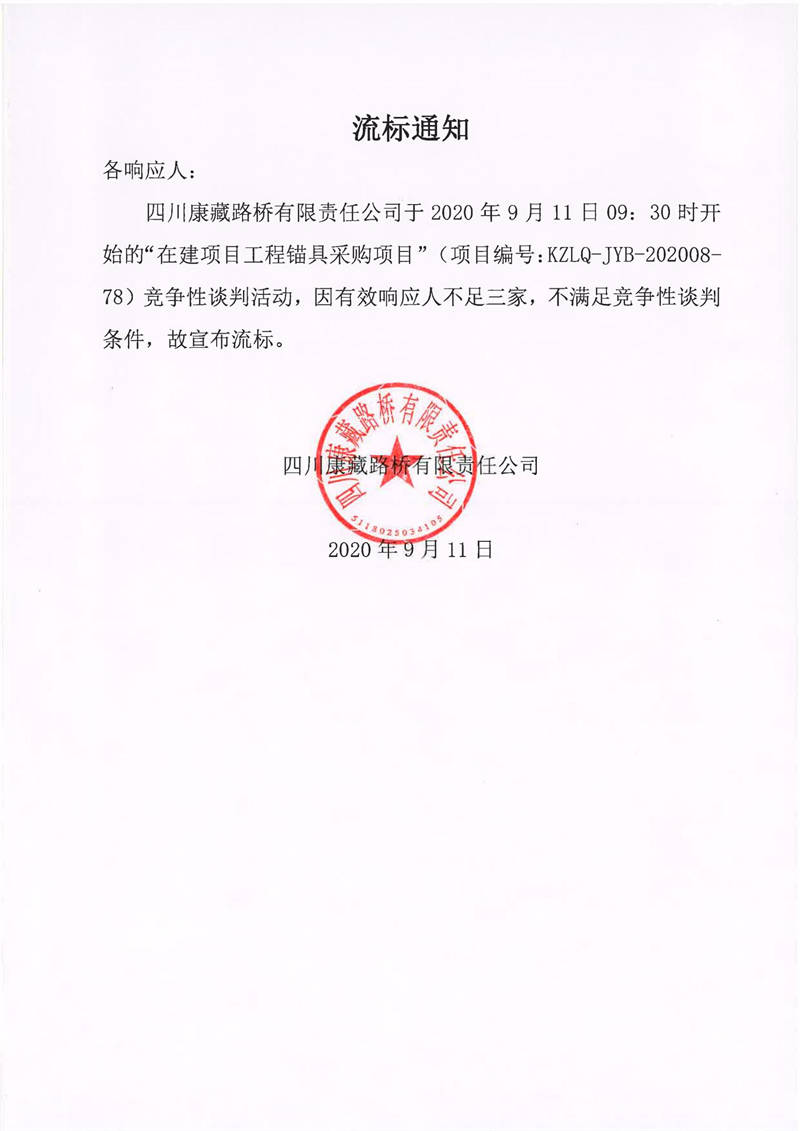 四川康藏路桥有限责任公司在建项目工程锚具采购竞争性谈判流标通知