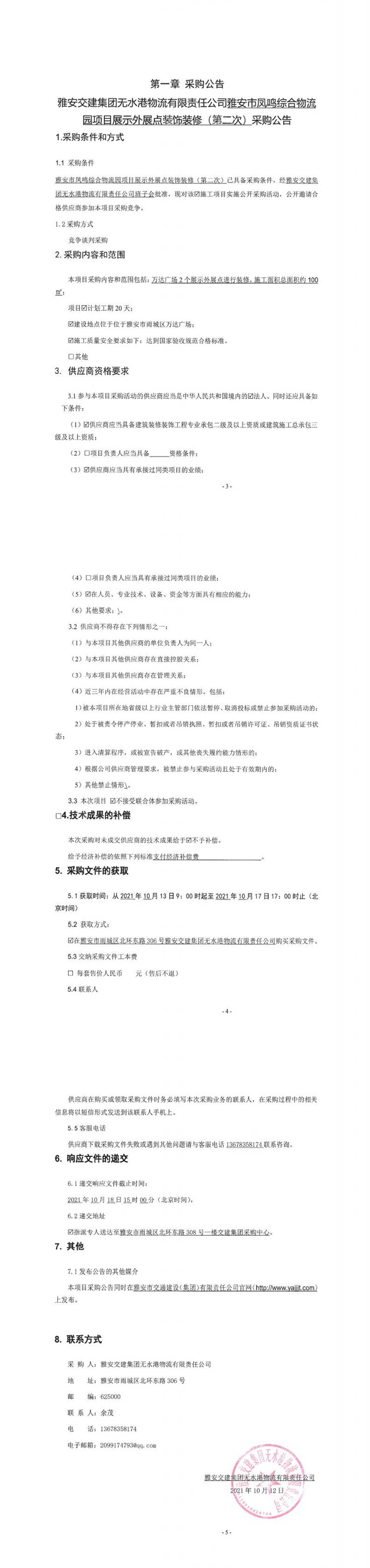 米兰体育-米兰(中国)官网 无水港物流有限责任公司雅安市凤鸣综合物流园项目售楼部装饰装修工程(第二次)采购公告