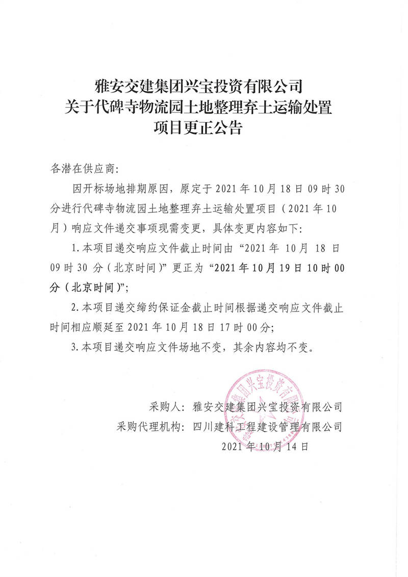 米兰体育-米兰(中国)官网 兴宝投资有限公司关于代碑寺物流园土地整理弃土运输处置项目更正公告