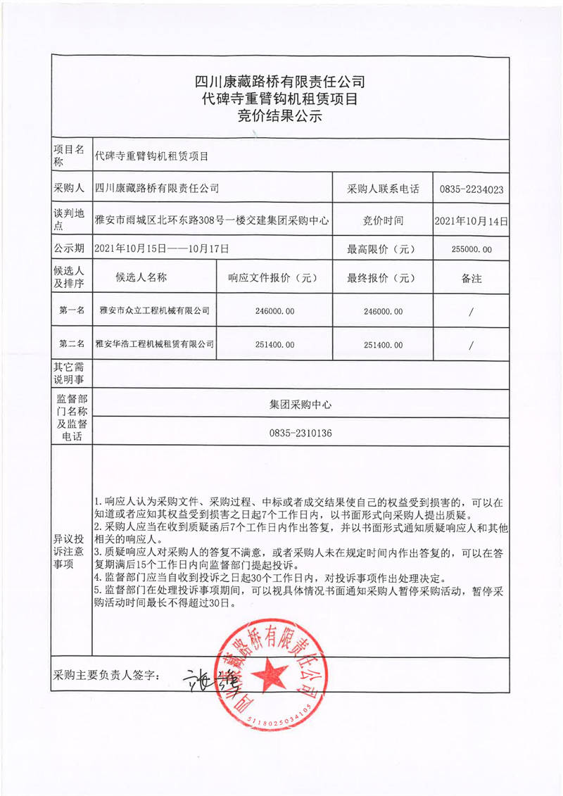 四川康藏路桥有限责任公司代碑寺重臂钩机租赁项目竞价结果公示