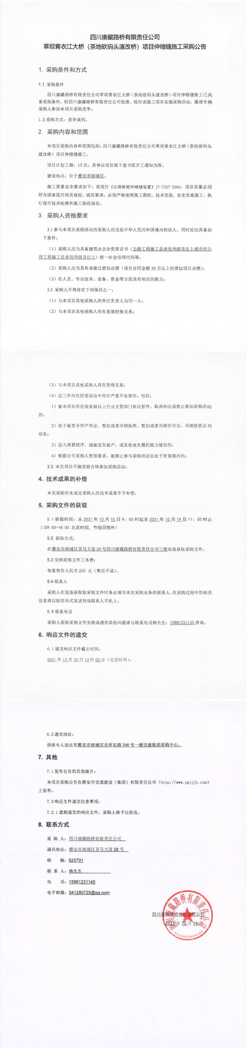 四川康藏路桥有限责任公司草坝青衣江大桥(茶地坎码头渡改桥)项目伸缩缝施工采购公告