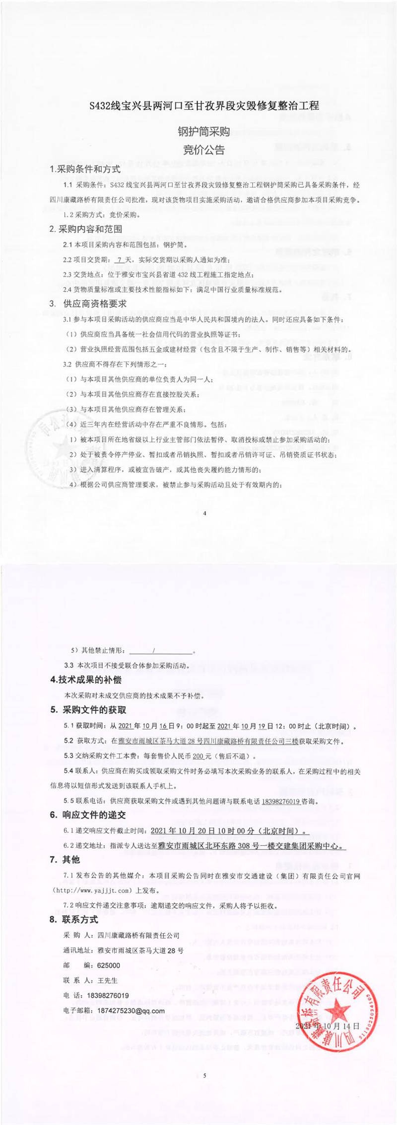 四川康藏路桥有限责任公司S432线宝兴县两河口至甘孜界段灾毁修复整治工程钢护筒采购竞价公告