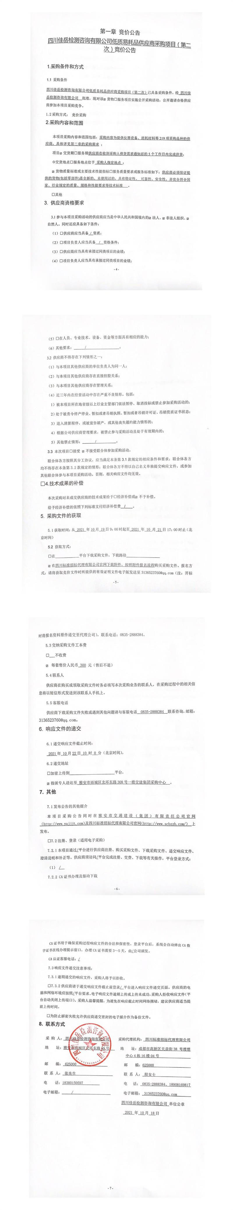 四川佳岳检测咨询有限公司低质易耗品供应商采购项目(第二次)竞价公告