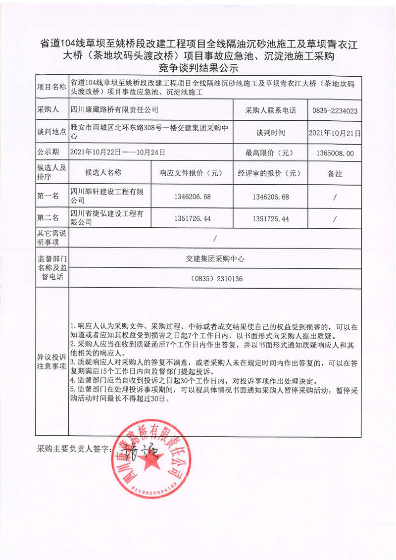 四川康藏路桥有限责任公司省道104线草坝至姚桥段改建工程项目全线隔油沉砂池施工及草坝青衣江大桥(茶地坎码头渡改桥)项目事故应急池、沉淀池施工采购竞争谈判结果公示