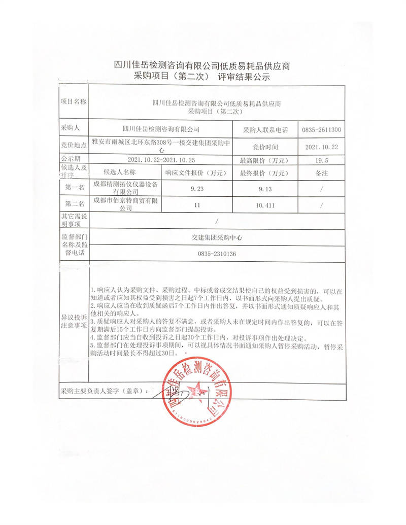 四川佳岳检测咨询有限公司低质易耗品供应商采购项目(第二次)评审结果公示