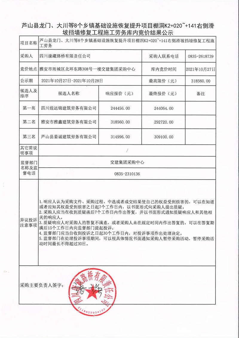 四川康藏路桥有限责任公司芦山县龙门、大川等8个乡镇基础设施恢复提升项目棚洞K2+020~+141右侧滑坡挡墙修复工程施工劳务库内竞价结果公示