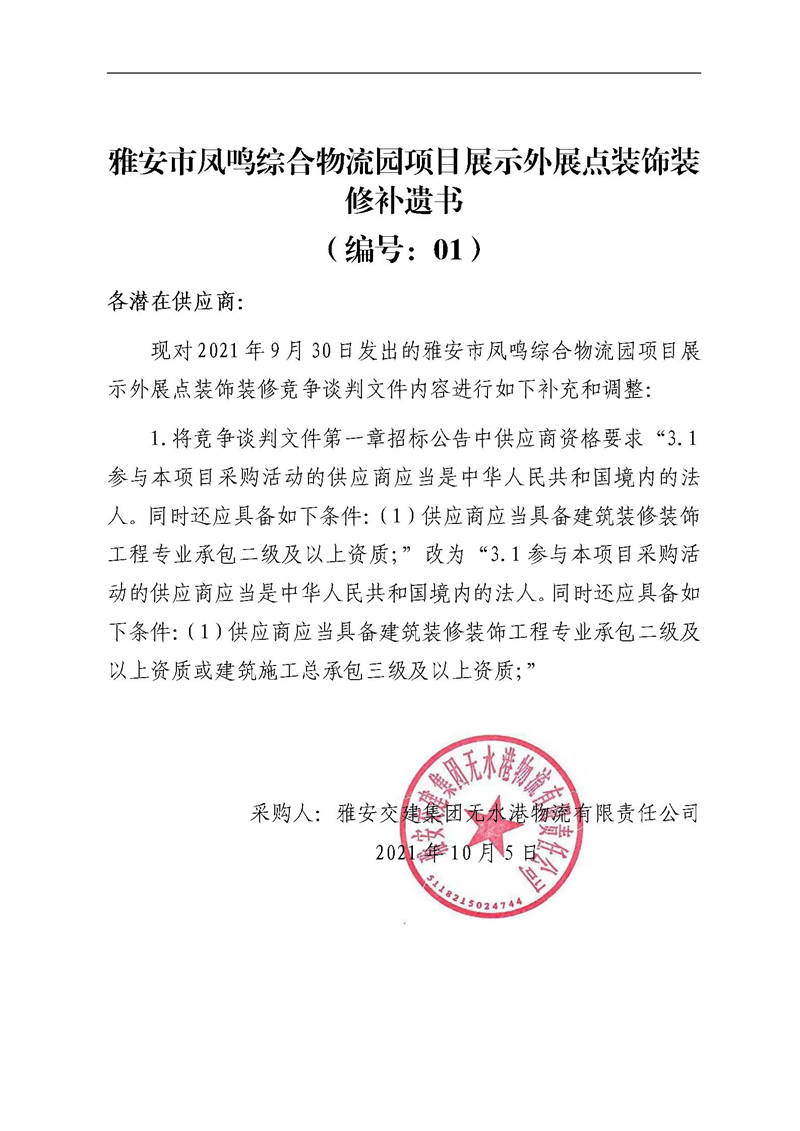 米兰体育-米兰(中国)官网 无水港物流有限责任公司雅安市凤鸣综合物流园项目售楼部装饰装修工程(第二次)采购公告