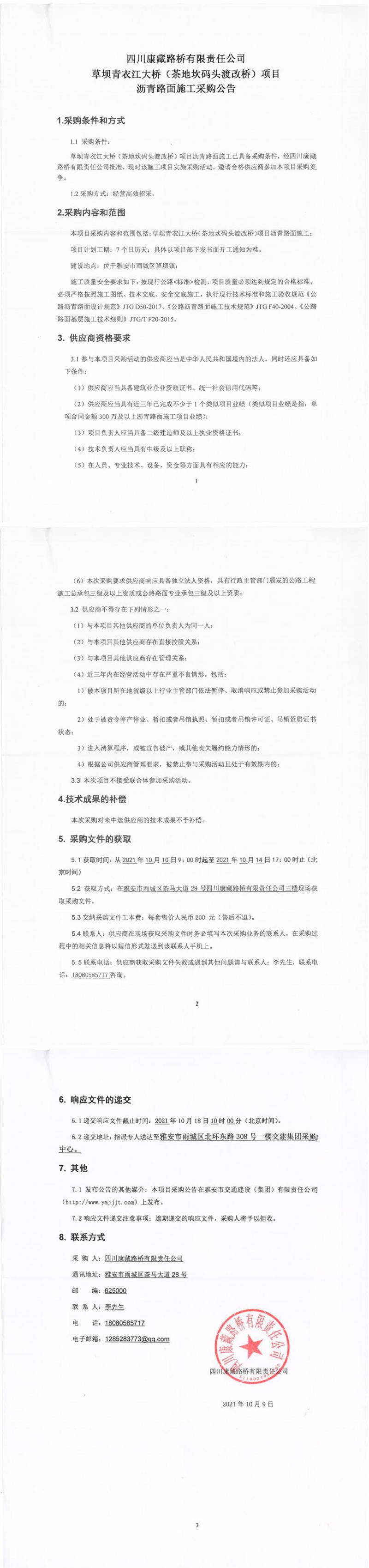四川康藏路桥有限责任公司草坝青衣江大桥(茶地坎码头渡改桥)项目沥青路面施工采购公告