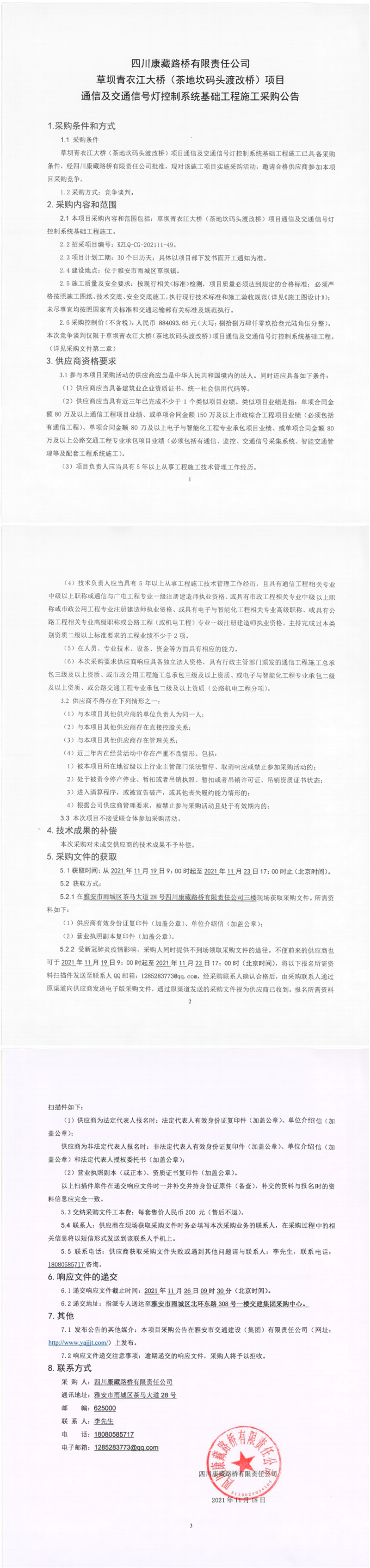 四川康藏路桥有限责任公司草坝青衣江大桥(茶地坎码头渡改桥)项目通信及交通信号灯控制系统基础工程施工采购公告