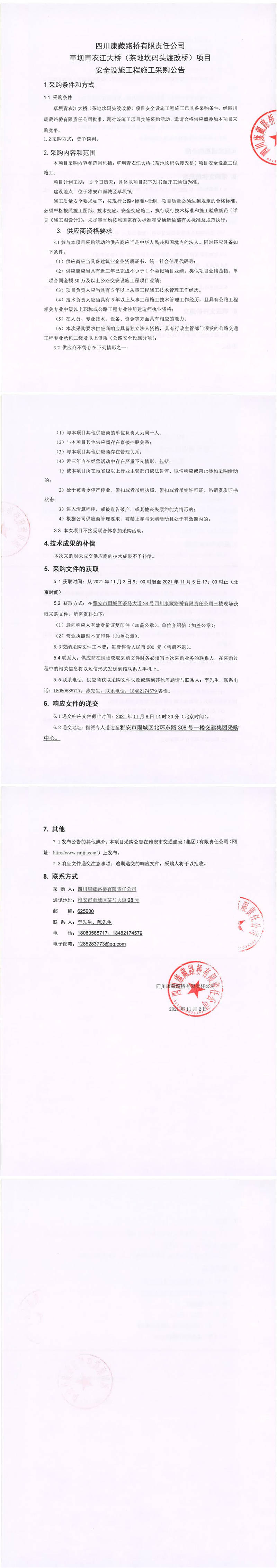 四川康藏路桥有限责任公司草坝青衣江大桥(茶地坎码头渡改桥)项目安全设施工程施工采购公告