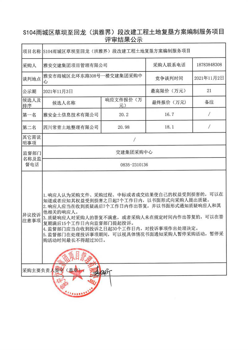 米兰体育-米兰(中国)官网 项目管理有限公司S104雨城区草坝至回龙(洪雅界)段改建工程土地复垦方案编制服务项目评审结果公示