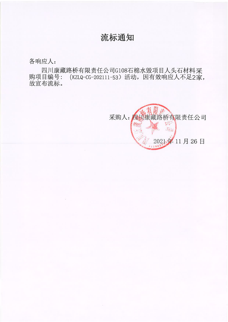 四川康藏路桥有限责任公司G108石棉水毁项目人头石材料采购流标通知