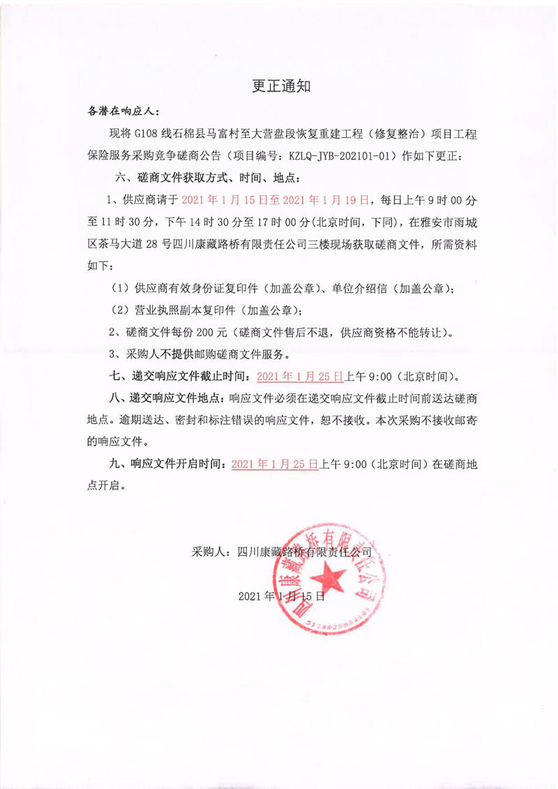 四川康藏路桥有限责任公司G108线石棉县马富村至大营盘段恢复重建工程(修复整治)项目工程保险服务采购更正通知