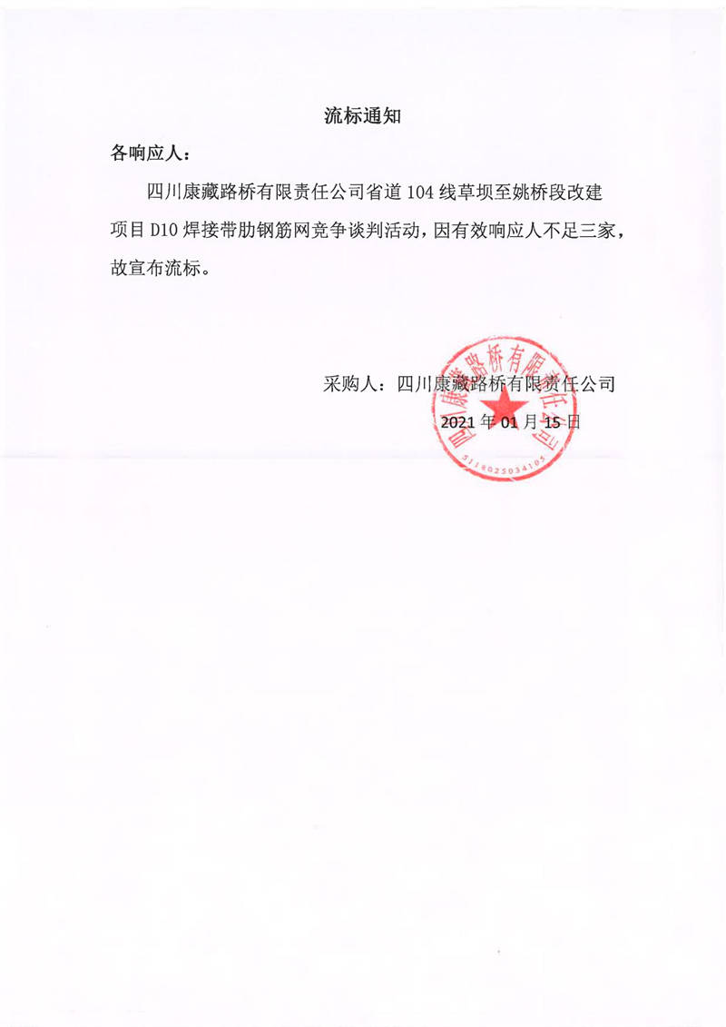 四川康藏路桥有限责任公司省道104线草坝至姚桥段改建项目D10焊接带肋钢筋网采购项目流标通知