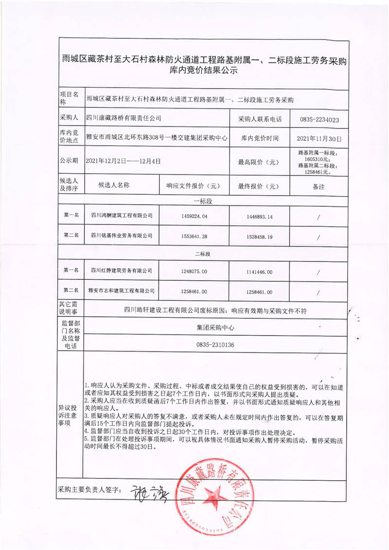 四川康藏路桥有限责任公司雨城区藏茶村至大石村森林防火通道工程路基附属一、二标段施工劳务采购库内竞价结果公示