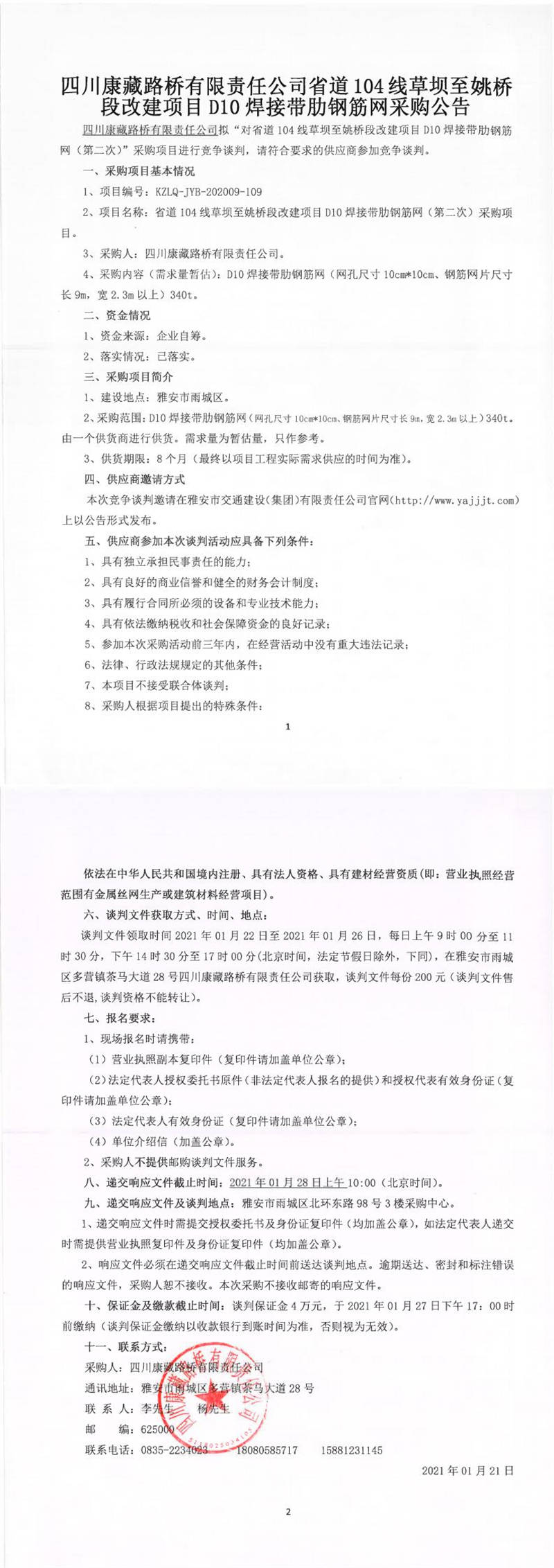 四川康藏路桥有限责任公司省道104线草坝至姚桥段改建项目D10焊接带肋钢筋网(第二次)采购公告
