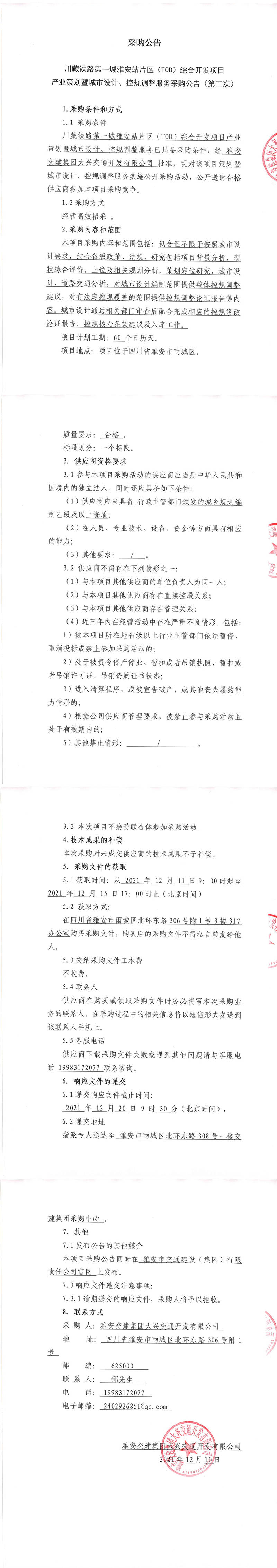 米兰体育-米兰(中国)官网 大兴交通开发有限公司川藏铁路第一城雅安站片区(TOD)综合开发项目产业策划暨城市设计、控规调整服务采购公告(第二次)