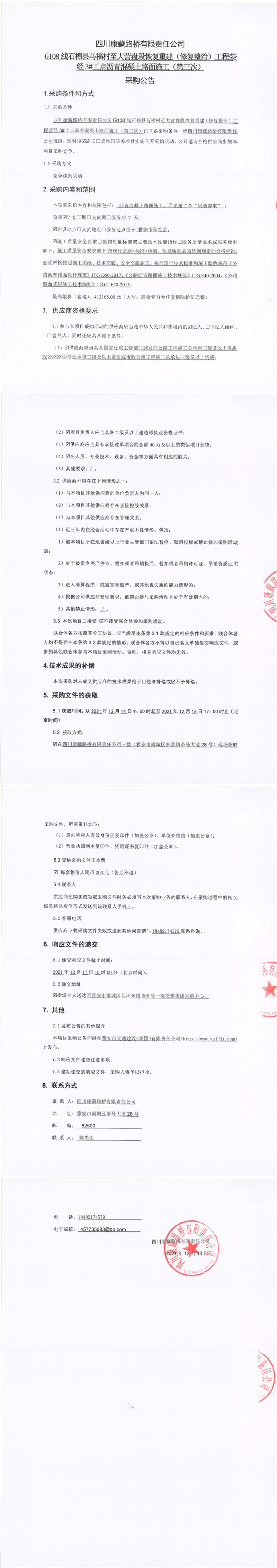 四川康藏路桥有限责任公司G108线石棉县马福村至大营盘段恢复重建(修复整治)工程荥经3#工点沥青混凝土路面施工(第三次)采购公告