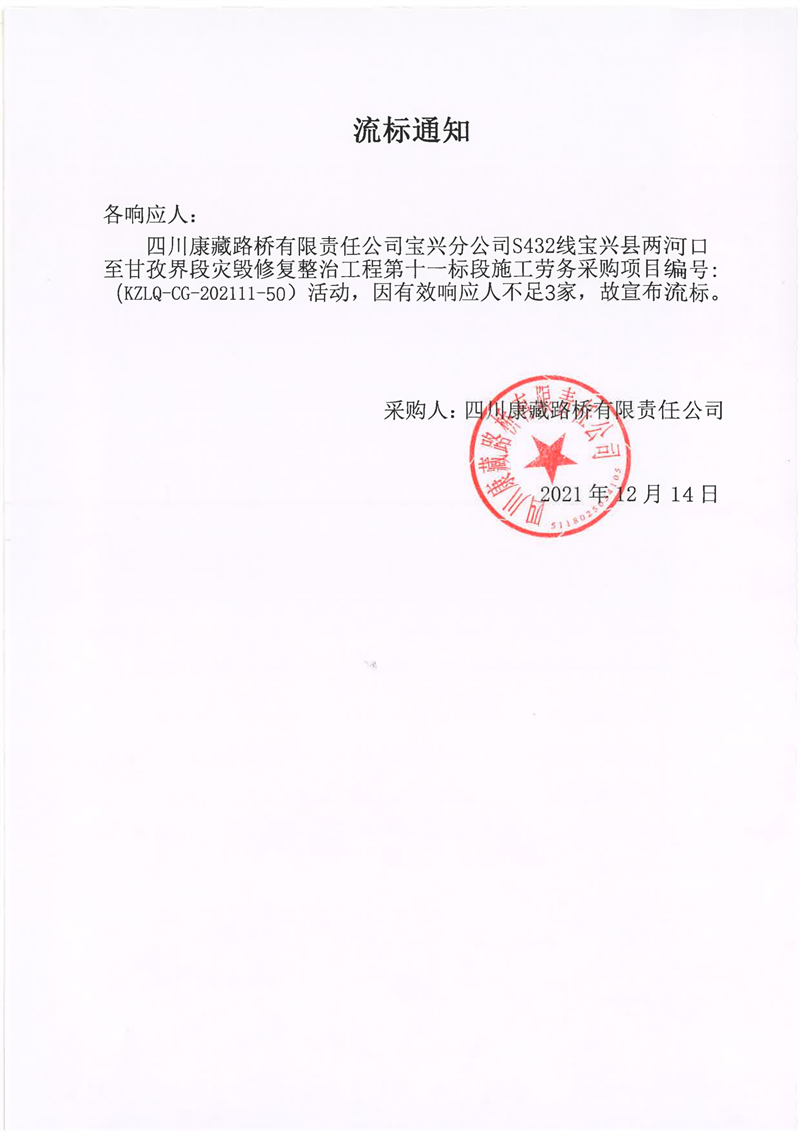 S432线宝兴县两河口至甘孜界段灾毁修复整治工程第十一标段施工劳务(第二次)流标通知