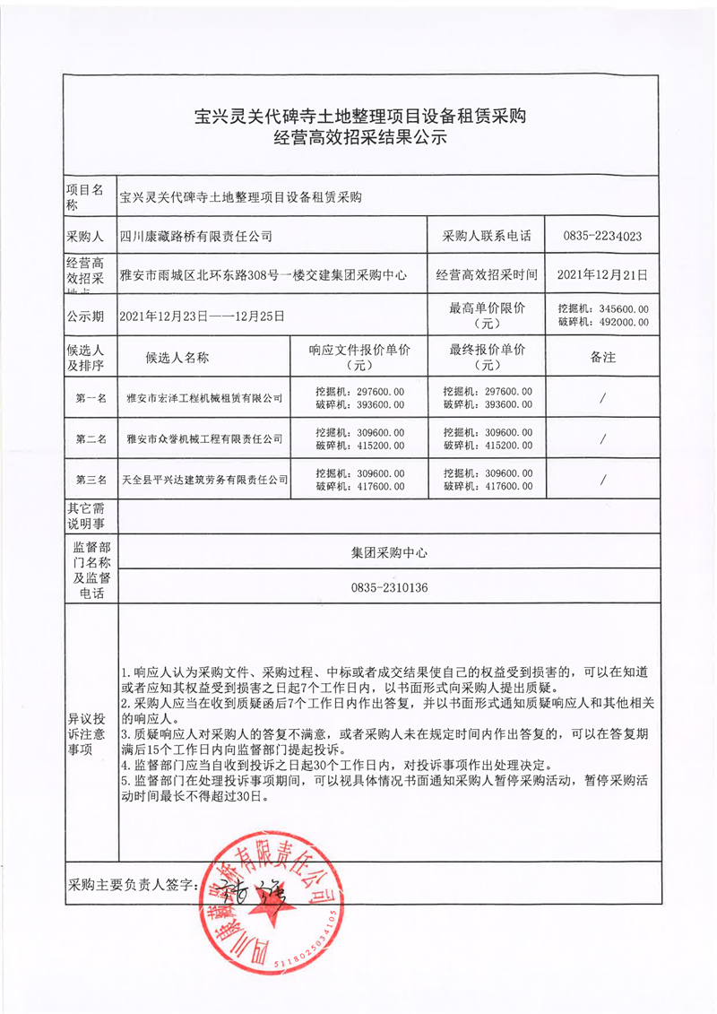 四川康藏路桥有限责任公司宝兴灵关代碑寺土地整理项目设备租赁采购经营高效招采结果公示
