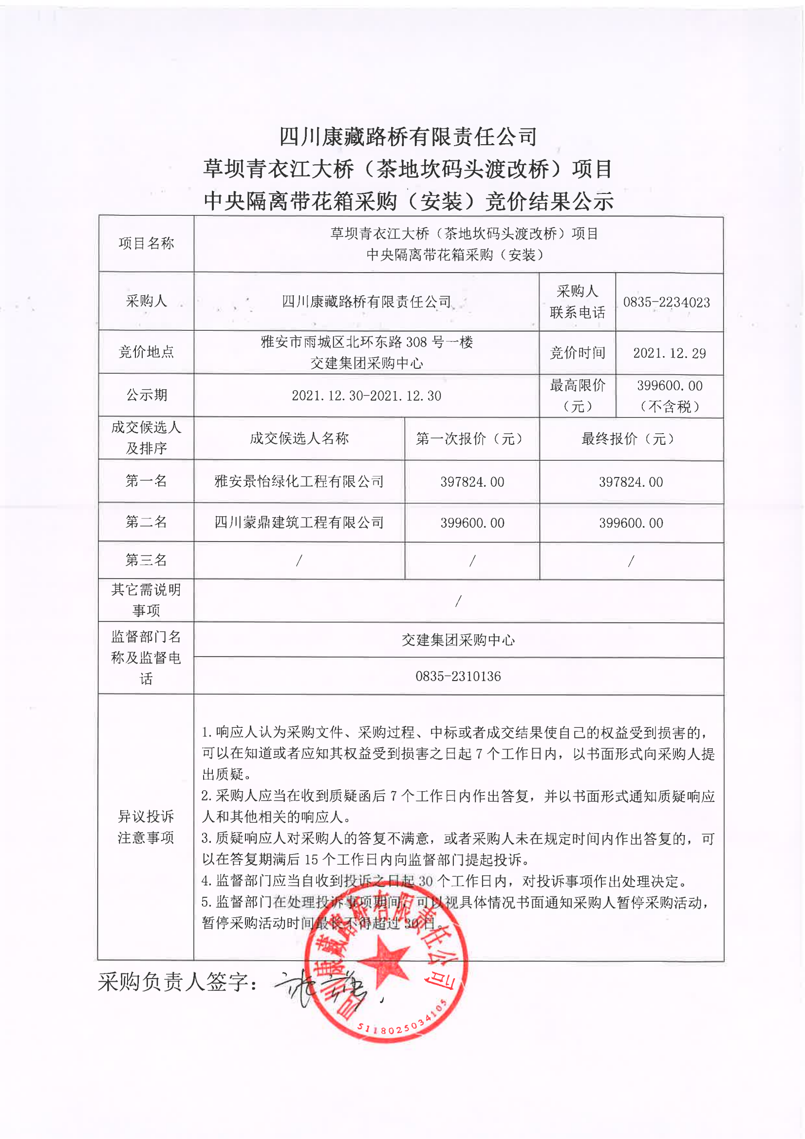 四川康藏路桥有限责任公司草坝青衣江大桥(茶地坎码头渡改桥)项目中央隔离带花箱采购(安装)竞价结果公示